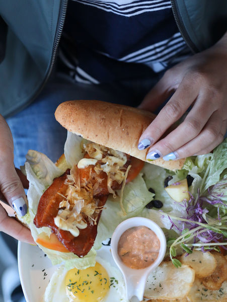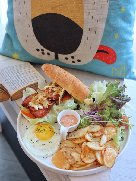 ▫️兩份輕食都有附沙拉跟半熟蛋,蓬鬆的帕瑪森軟法包著淋上美奶滋跟柴魚片的板烤雞腿,入口是討喜的章魚燒風味,腿排獨家醃漬緊實有彈性,薯片脆口好吃不油膩。