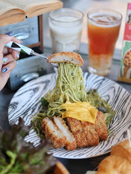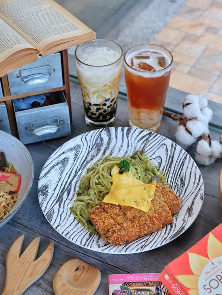 ▫️size不小的炸豬排上頭鋪上金黃起司片,酥脆厚實。青醬義麵本體雖然平價但醬料處理上不馬虎,可以清楚看到九層塔打成的細碎葉片,入口能感覺醬汁跟麵條之間的契合度。