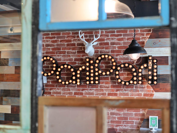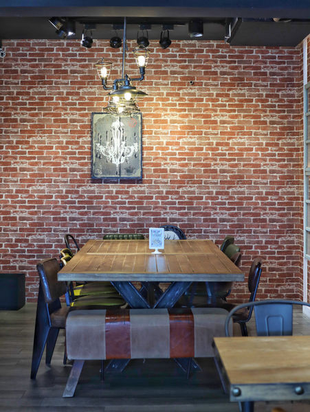 右手邊的裝潢是復古工業風,紅磚牆、霓虹燈等元素,也有提供可容納10人左右的大桌哦。