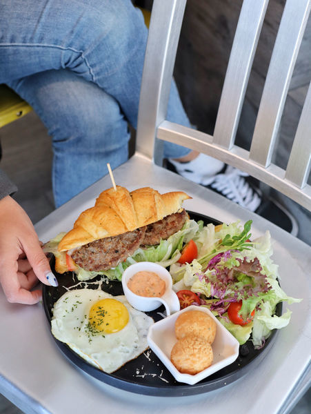 ▫️牛肉可頌堡則是夾上兩片牛肉漢堡排,肉味鮮明不乾柴,小點有兩顆香濃起司球,熱熱吃還會牽絲喔。
