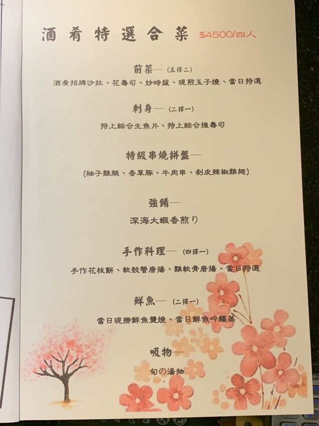 (前菜3擇1-酒肴招牌沙拉)、(刺身2擇1-特級綜合生魚片)、(燒き5擇2-剝皮辣椒雞翅、豚五花照燒)、(揚物-海陸炸物拼盤)、(鮮魚-當日現撈鮮魚鹽燒)、(吸物-季節鮮魚上湯)