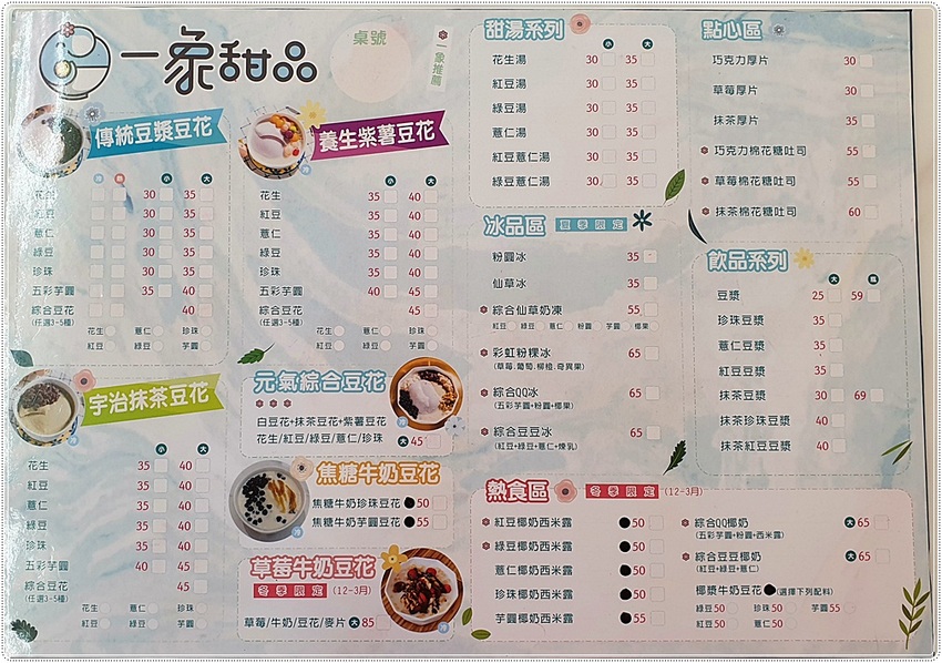 以傳統豆漿豆花、宇治抹茶豆花、養生紫薯豆花、甜湯、冰品(夏季限定)、熱食(冬季限定款)