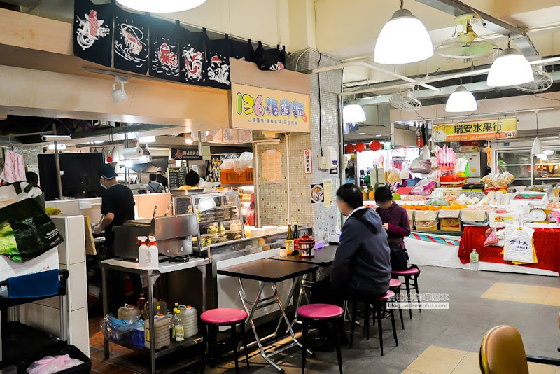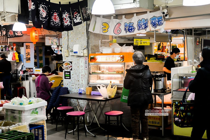 136海鮮麵,就在瑞安街上安東市場的136號攤位,從捷運科技大樓站步行大約6分鐘可抵達,從這個正門一進去,就會看到了!大門一進來,目光稍微往左,在這個轉角就會看到「136海鮮麵」的布旗招牌