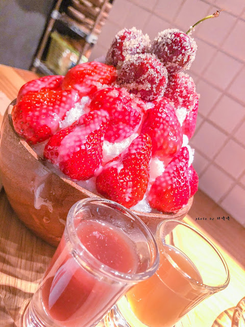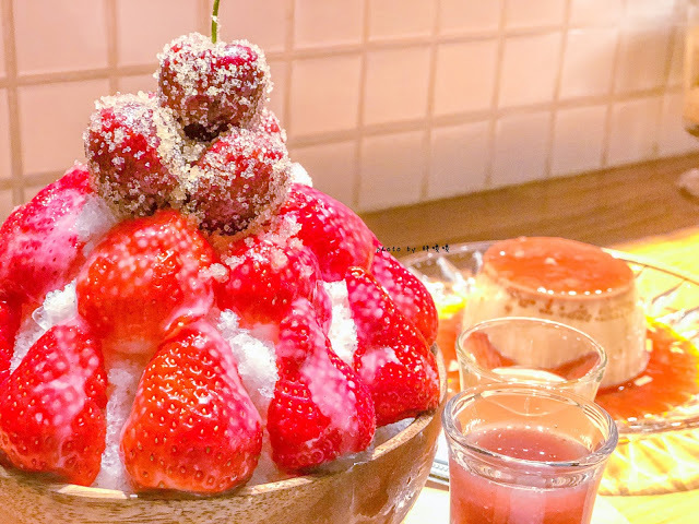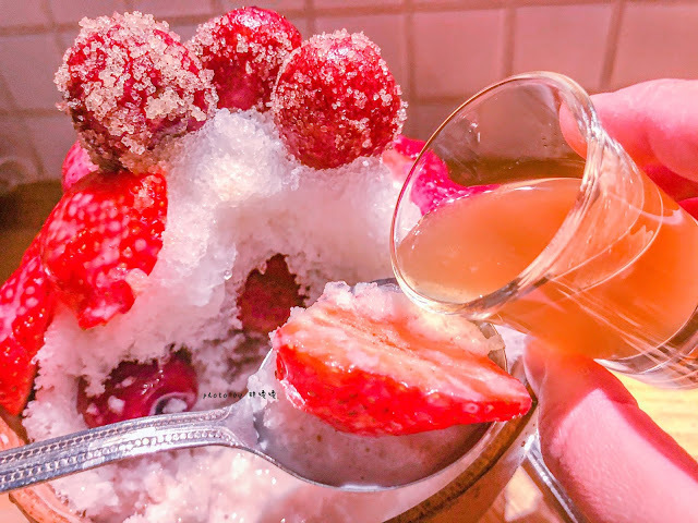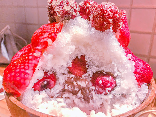 綿密刨冰上頭鋪著切對半的草莓