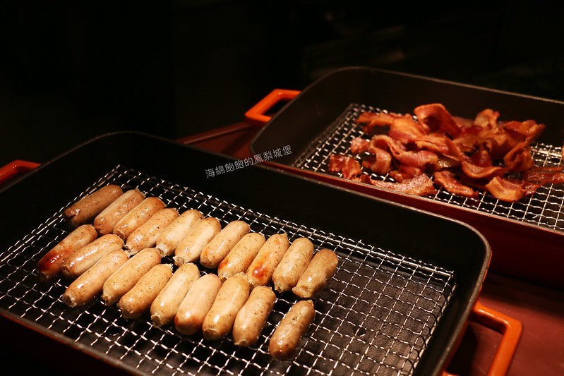 熱食區有熱狗、培根、香腸、香菇、薯塊、青菜、滷肉