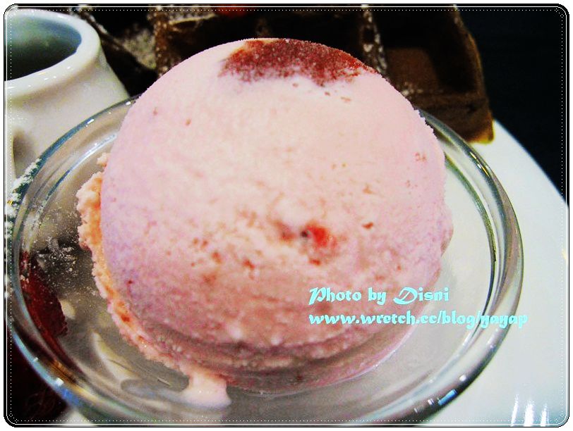 這兒有一球草莓冰淇淋,當然可以單吃,也可以搭配著鬆餅吃。
