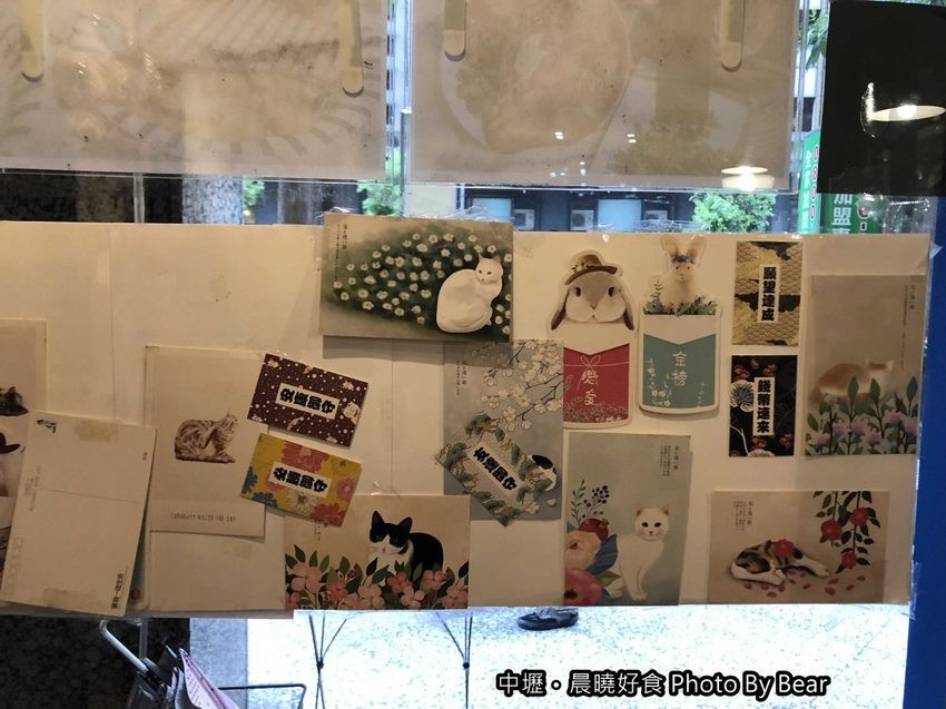 一進門右手邊有書報雜誌架,玻璃門後也貼了好多貓咪的明信片