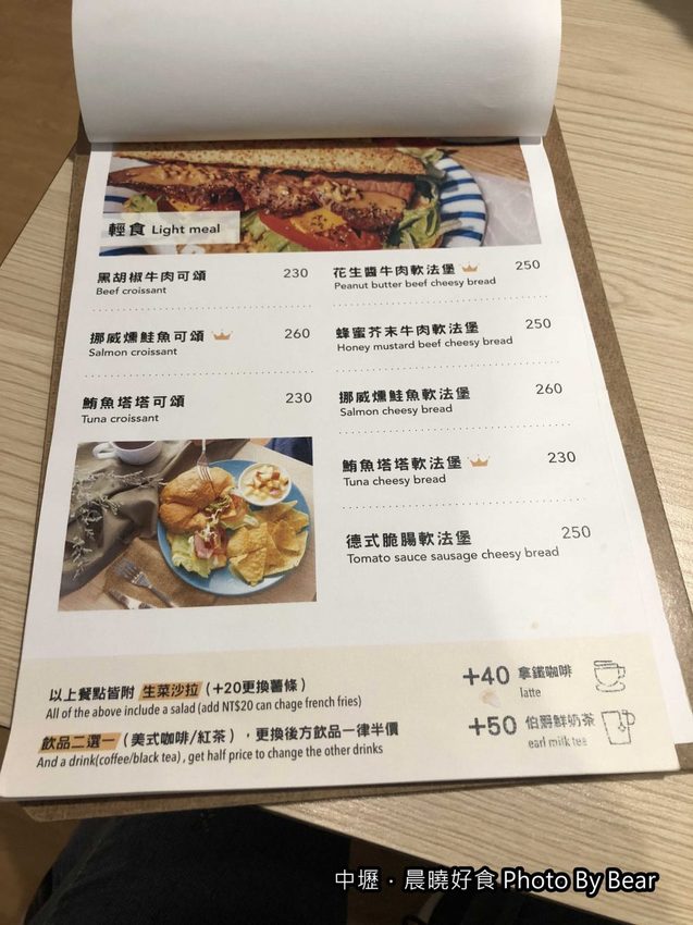 第二頁是輕食,有可頌和軟法堡,共有八款可選擇(價格約$230~$260)