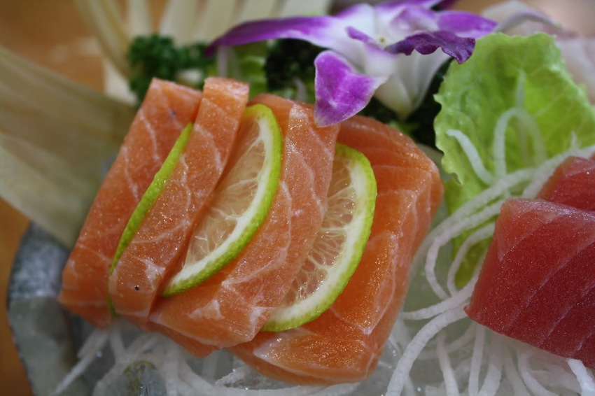 三種口味生魚片 , 分別是鮭魚 , 旗魚和鮪魚