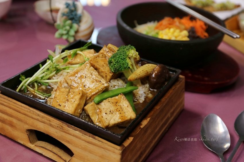 黑胡椒鮮蔬豆腐鐵板飯$100元,鮮蔬搭配鐵板飯淋上店家自製的黑胡椒醬,拌勻後食用很威,是個連朋友都無法擋的美食。