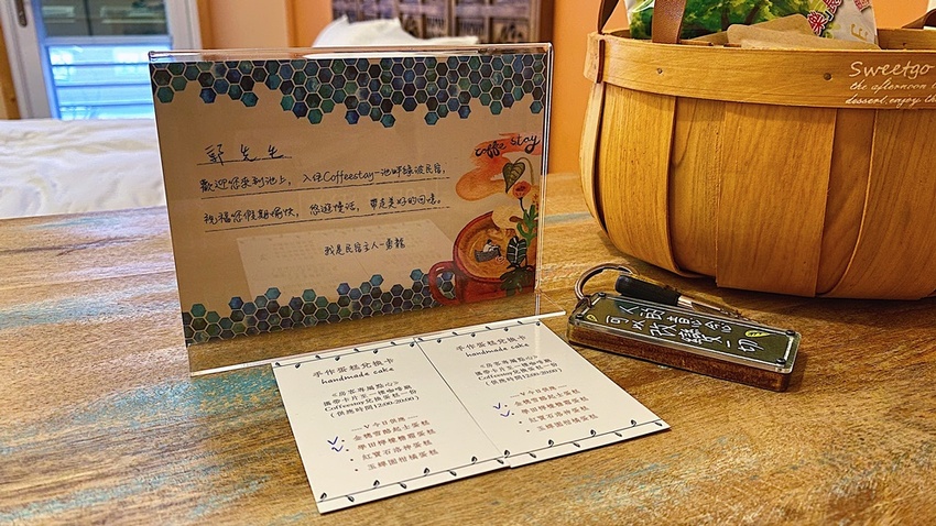 進門後做以區分空間用的櫃子上擺了與池上聯名的米乖乖、紅烏龍茶包以及咖啡包能喝。桌上兩張手做蛋糕兌換卡就是剛剛迎賓下午茶所品嘗到的那兩種口味,只能說來住宿還可以吃到咖啡廳等級的茶點相當不錯呢