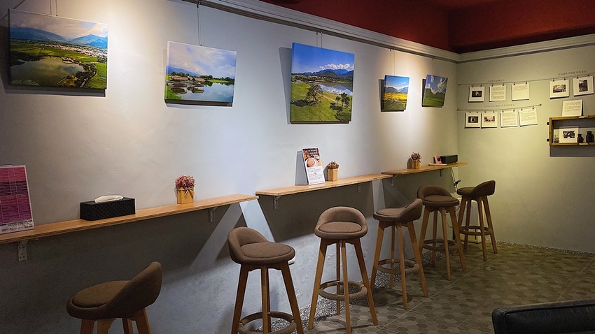 賴老師咖啡廳在建築後半部也還有美如藝品展示空間的座位區。除了有些書籍可以恣意閱讀外,牆上掛著老闆朋友所攝影的池上風光。特別的是刻意保留原本紅磚的這面牆壁,有來自西班牙藝術家Ripolles在池上工作時的側拍,而二、三樓民宿也是以這位老先生名字翻成綠波而得名