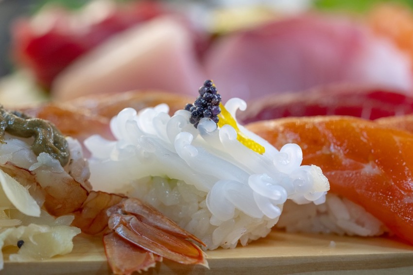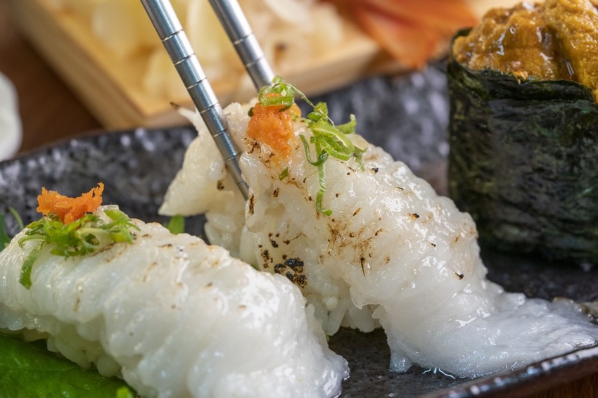 而醋飯酸度適中,沾點醬油入口超級對味!其中軟絲鮮甜Q彈帶爽脆口感