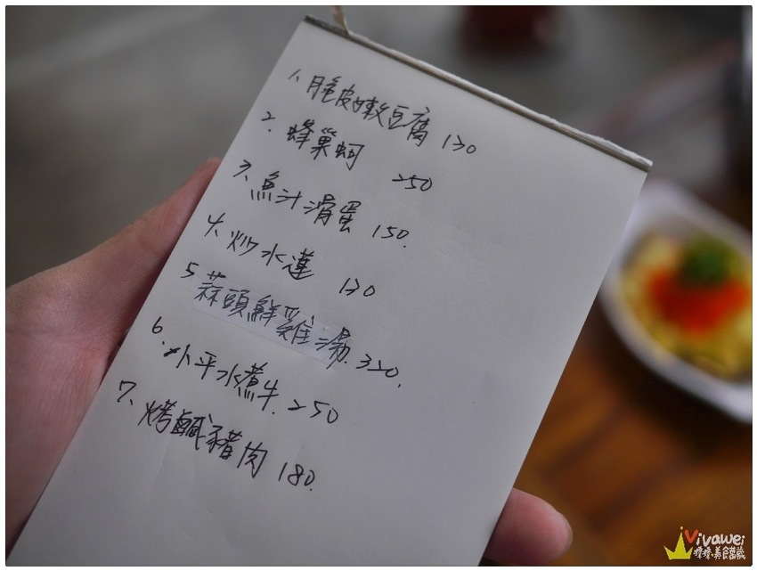 ▲這是我們今天享用的餐點,有脆皮嫩豆腐、蜂巢蚵、魚汁滑蛋、炒水蓮、蒜頭鮮雞湯、小平水煮牛、烤鹹豬肉!因為內用有白飯無限吃,這樣的份量適合4-5人用享!