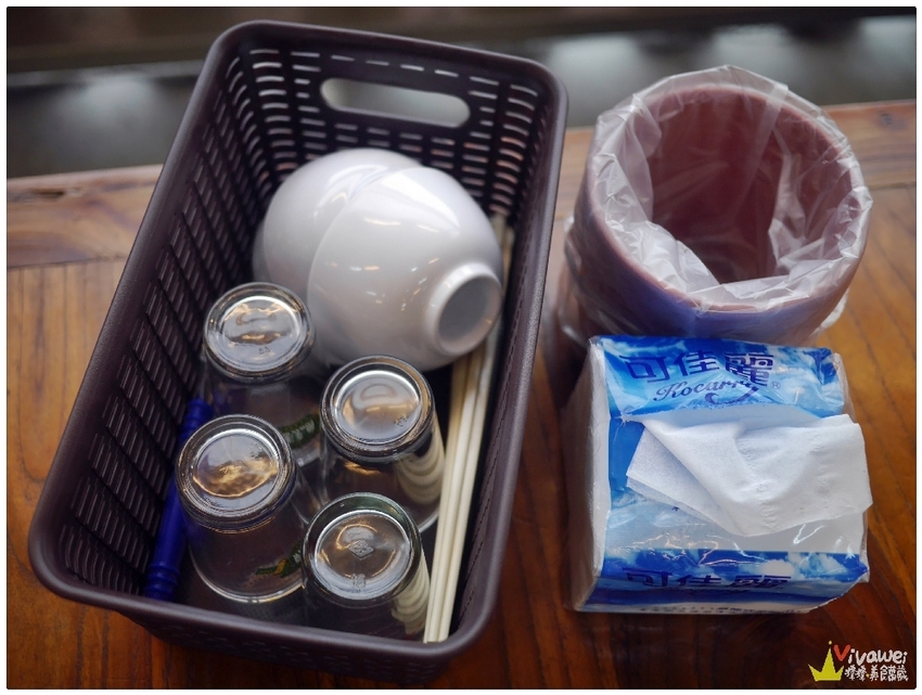 ▲桌面上本來就有擺放小垃圾桶和衛生紙,入座以後店家會給小籃子,裡面放著碗筷、杯子和開瓶器。