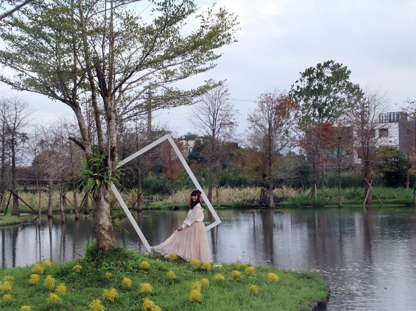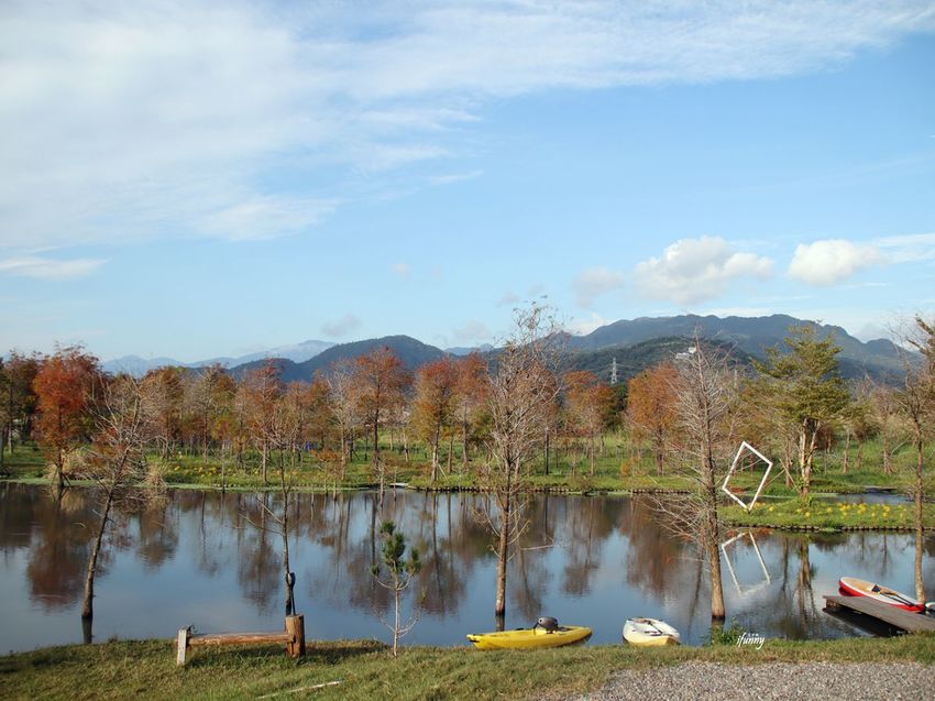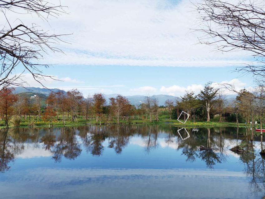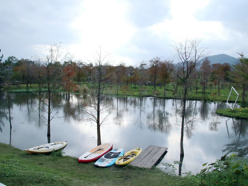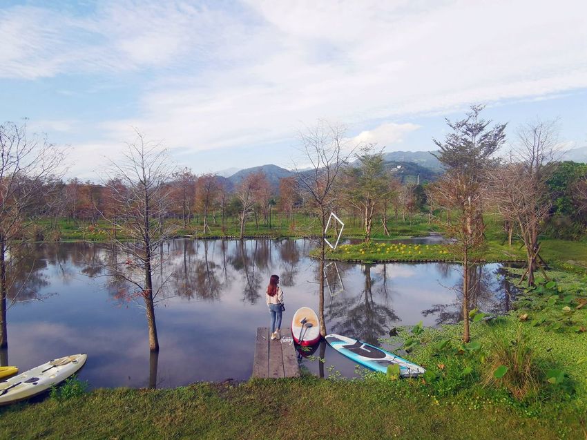 十六崁宜蘭民宿的主人將一甲的土地,規劃了300棵的落羽松,並設置了這個夢幻的人工湖,湖面照映著藍天白雲及環湖落羽松,這樣的美景令人一眼就愛上!而因為一天只招待一組客人,所以這整個大園區都是我們獨享,不僅具有隱私,而且更不用顧慮別人的感覺,實在太讚了!