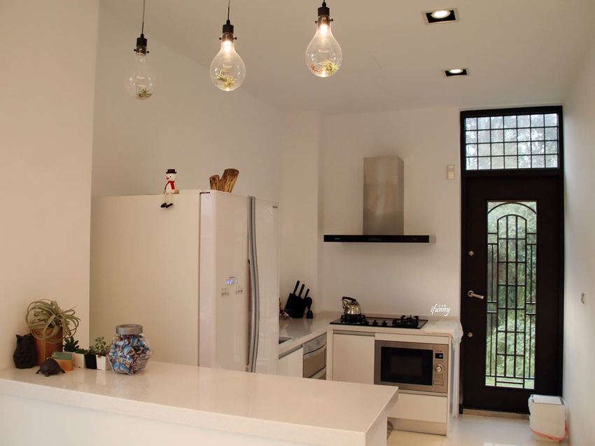 而令現場女生同時尖叫的是這個潔白的廚房了!有完整的廚具、崁入式烤箱、烘碗機、瓦斯爐及大冰箱,這加上無敵的採光,實在太棒了!大冰箱內還備有豆奶及礦泉水,可自行取用。