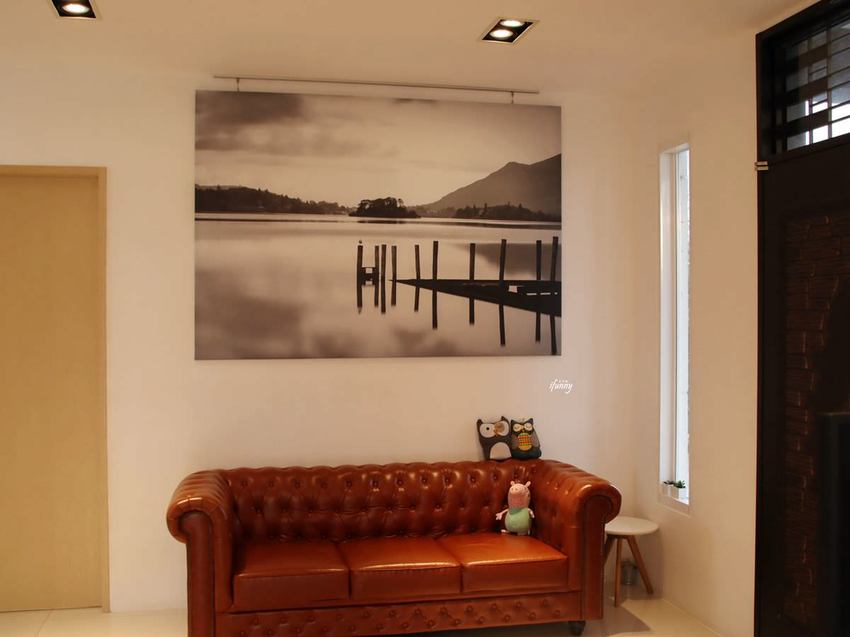 在進餐廳前,有這樣一個舒服的沙發區,而吸引艾方妮目光的是牆上的畫。靜謚的湖面,令人格外地平靜。