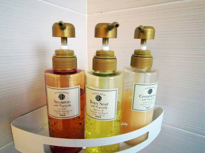 浴室備有來自日本POLA shower break plus,是日本高級飯店專用的蜂王漿洗髮精、潤髮乳及沐浴乳,洗完後從頭到腳都香香滑滑的。