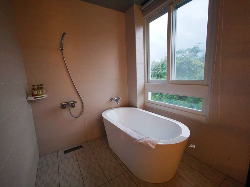 浴室備有美麗的浴缸,千萬不要錯過啊!若想擁抱綠意景色一起入浴,就可以不需拉上窗簾,畢竟住客都是自己人XDD