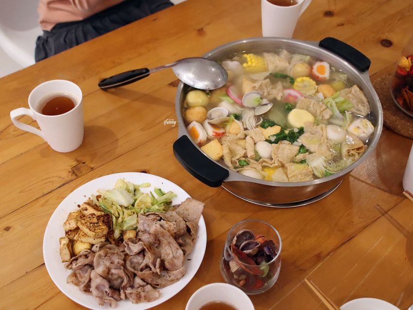 在來十六崁民宿前,我們特地到宜蘭在地最大連鎖超市-喜互惠,購買了600元的食材來煮晚餐。不僅由安妮自行熬了火鍋湯底,煮了一大鍋的火鍋,另外尼克還展現了炒功,炒了豬肉片、高麗菜及煎豆腐,讓我們四個人這天簡直飽到天靈蓋啊!