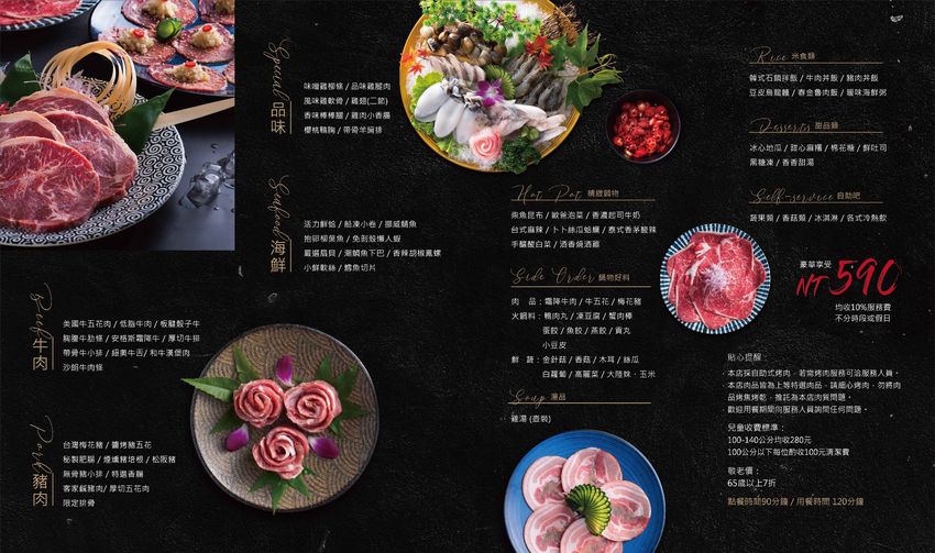 最新的MENU改成均一價$590/人,不再分兩種不同價位,燒烤品項上有做些微的調整,加上精緻鍋物食材、海鮮等依舊是超過50種食材可以吃到飽。