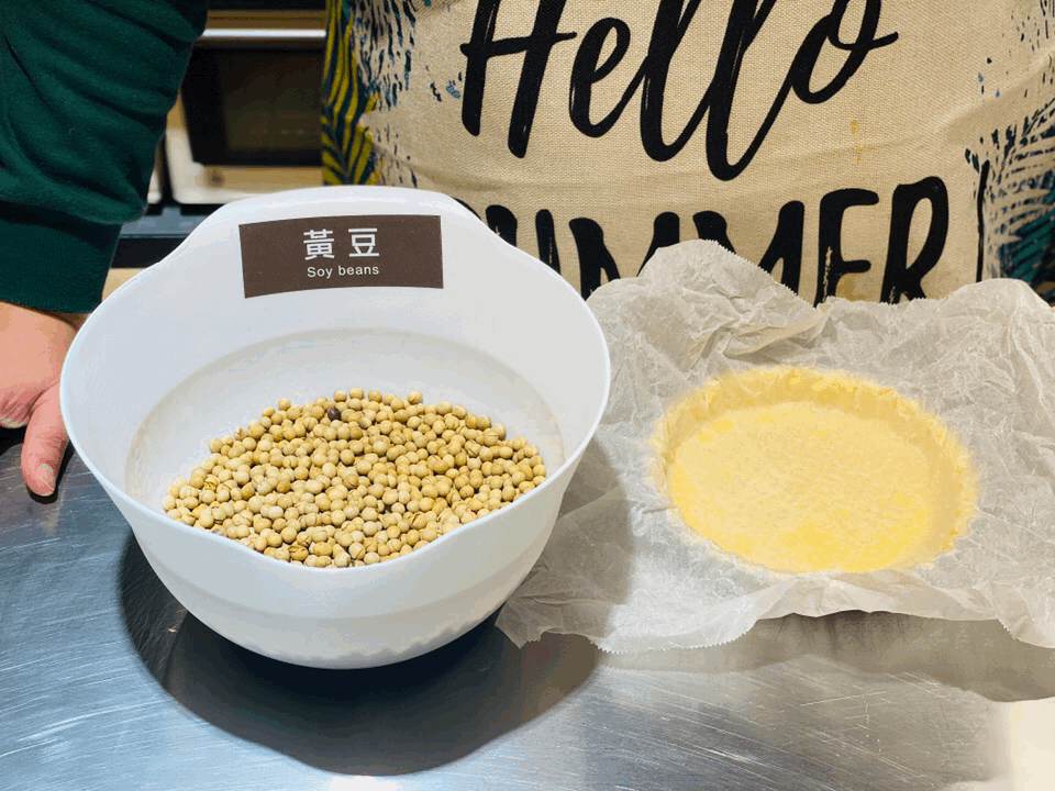 ▼完成戳洞、鋪好黃豆後送入烤箱啦~