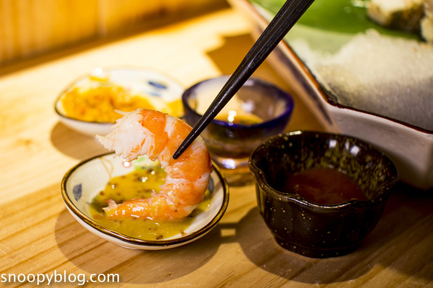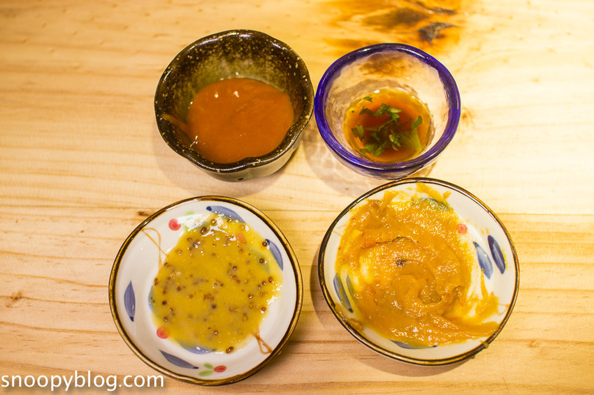 可以選擇3種醬料來搭配海鮮,史努比選了味噌芥子、紫蘇桔醋、微辛雞尾酒,