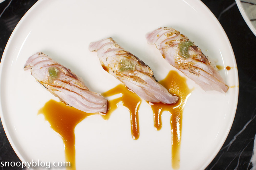 比目魚鰭邊油脂豐富經過炙燒後散發著迷人的香氣、口感軟綿。