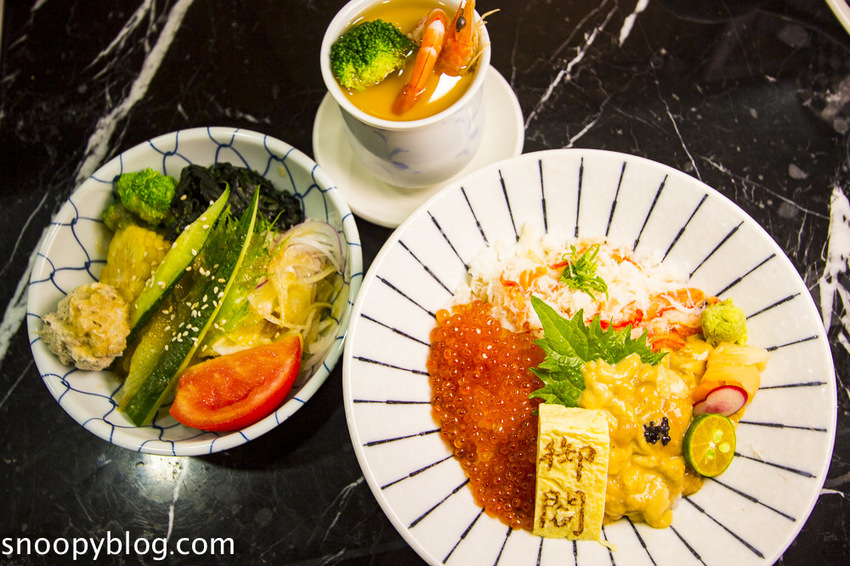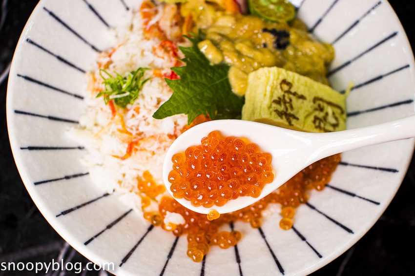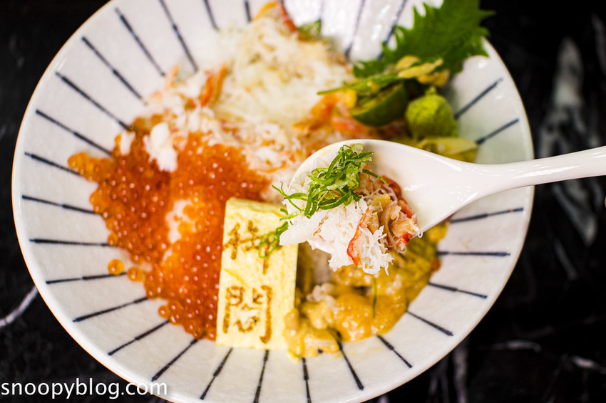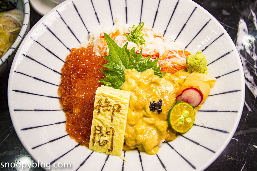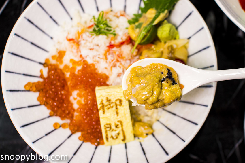 海膽、蟹肉和鮭魚卵組合的三色丼光是鮮豔的顏色就好吸睛,