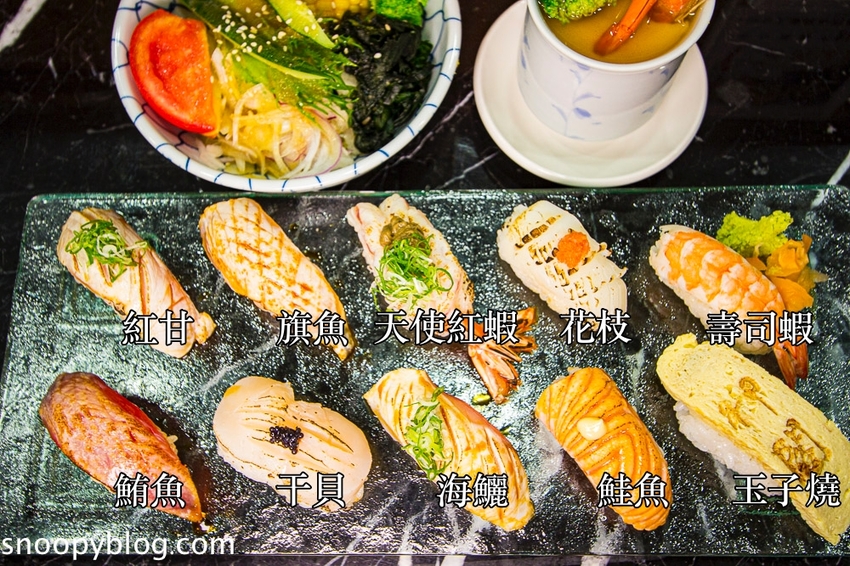 鮪魚、干貝、海鱺、鮭魚和玉子燒,十種不同壽司、十種不同口感。