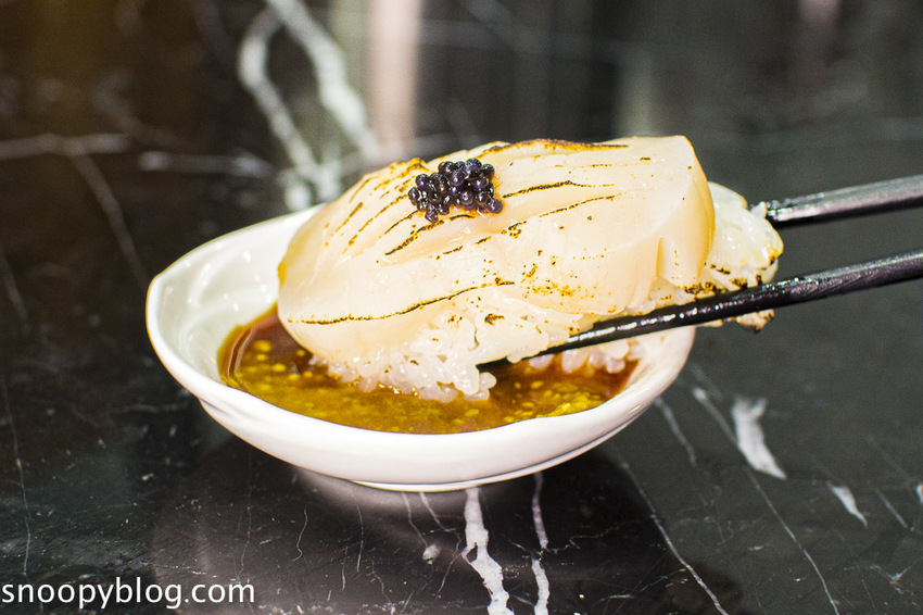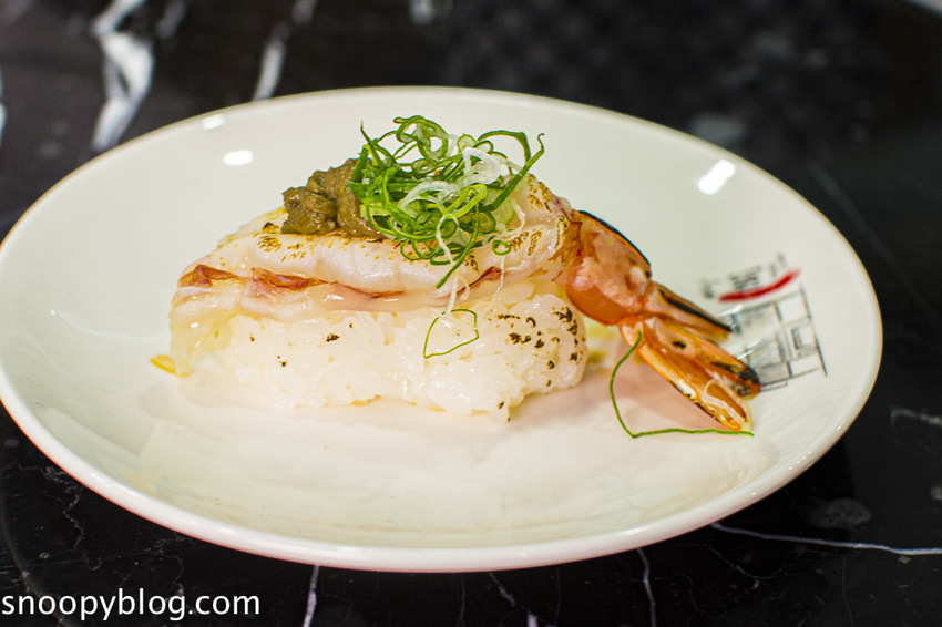 天使紅蝦炙壽司鮮嫩、甜度高,上面還加了蟹膏,喔伊係啊。