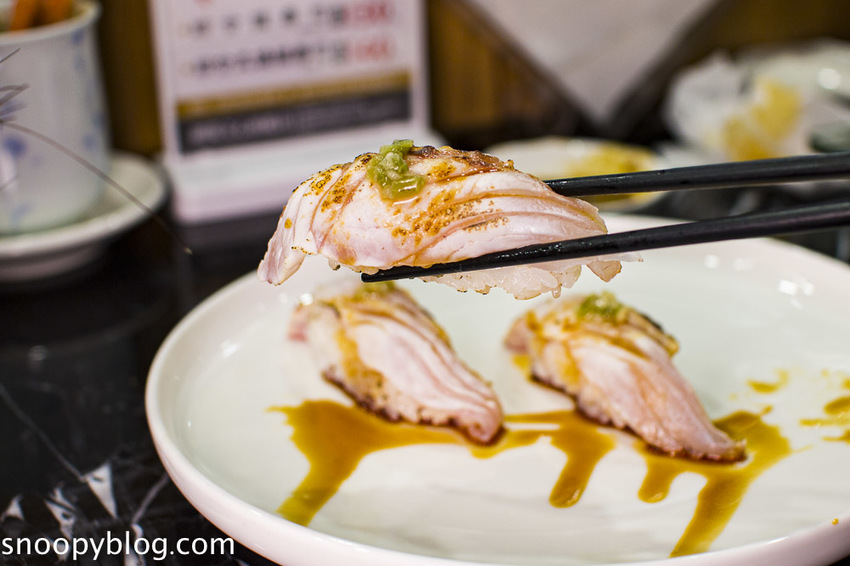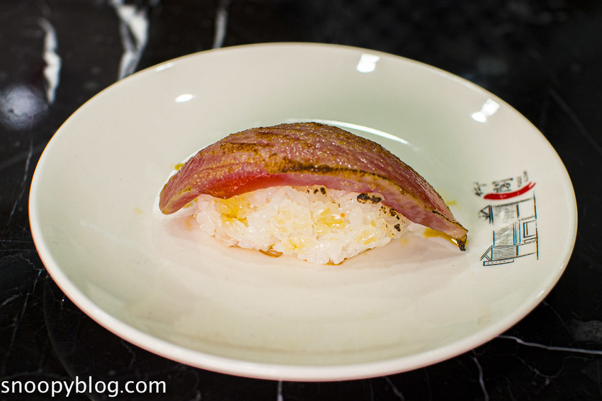 鮪魚炙壽司油脂豐富、軟Q甘甜。