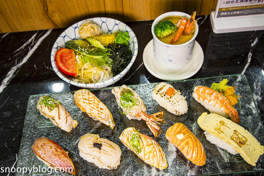壽司定食本來就有加沙拉、茶碗蒸、湯品和甜點直接就是套餐不需再加價升級,