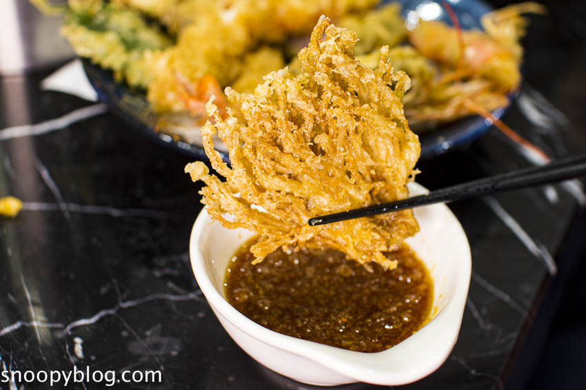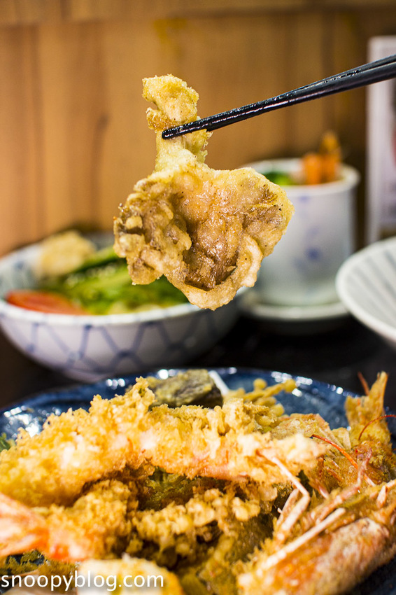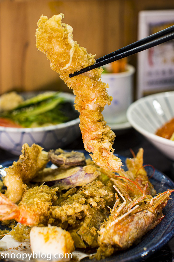 天使紅蝦外皮裹著酥炸麵衣外酥內軟。