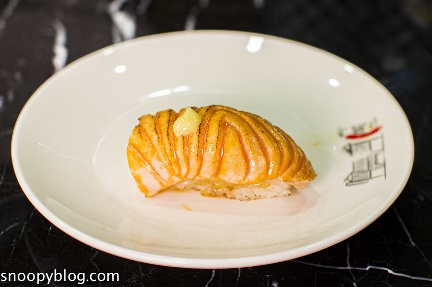 炙燒過後的鮭魚散發出迷人的油脂香氣。