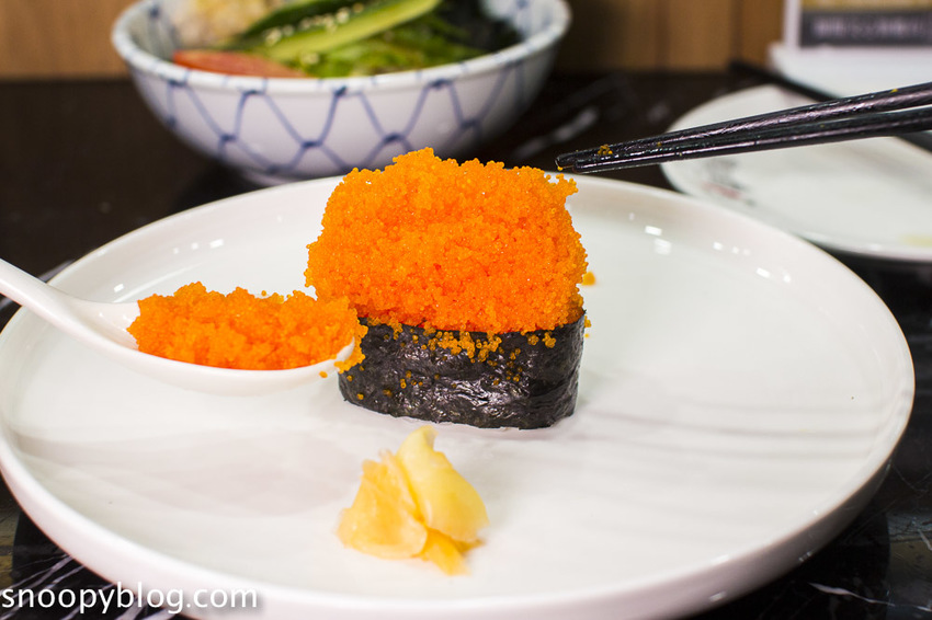 我們把魚卵分三次撥到湯匙裡吃掉,最後再吃掉正常版的魚卵壽司,