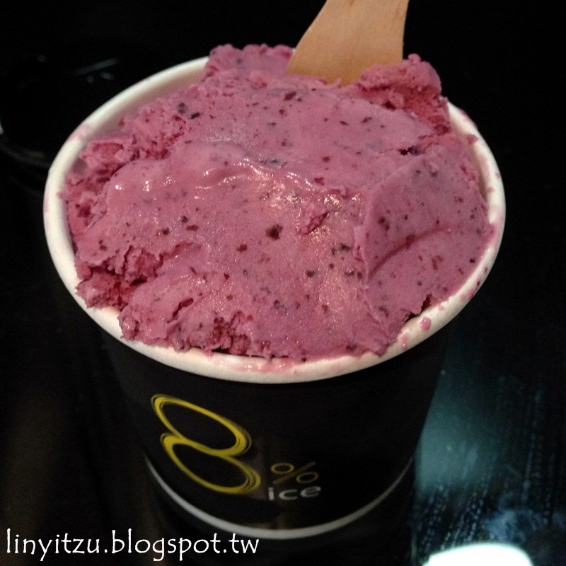穿衣服偶有玫瑰黑醋栗風格的同事點了她自認很適合她的玫瑰黑醋栗口味,而我則是點了藍莓口味。我發現水果口味的冰淇淋在冰櫃中的樣子看來較鬆散,而比較奶的口味(如巧克力、芝麻等)則感覺較綿密,雖然說放到杯子裡長得差不多,但店員在填充杯子時的動作略有不同。簡單來說水果系列吃起來是比較清爽啦!
