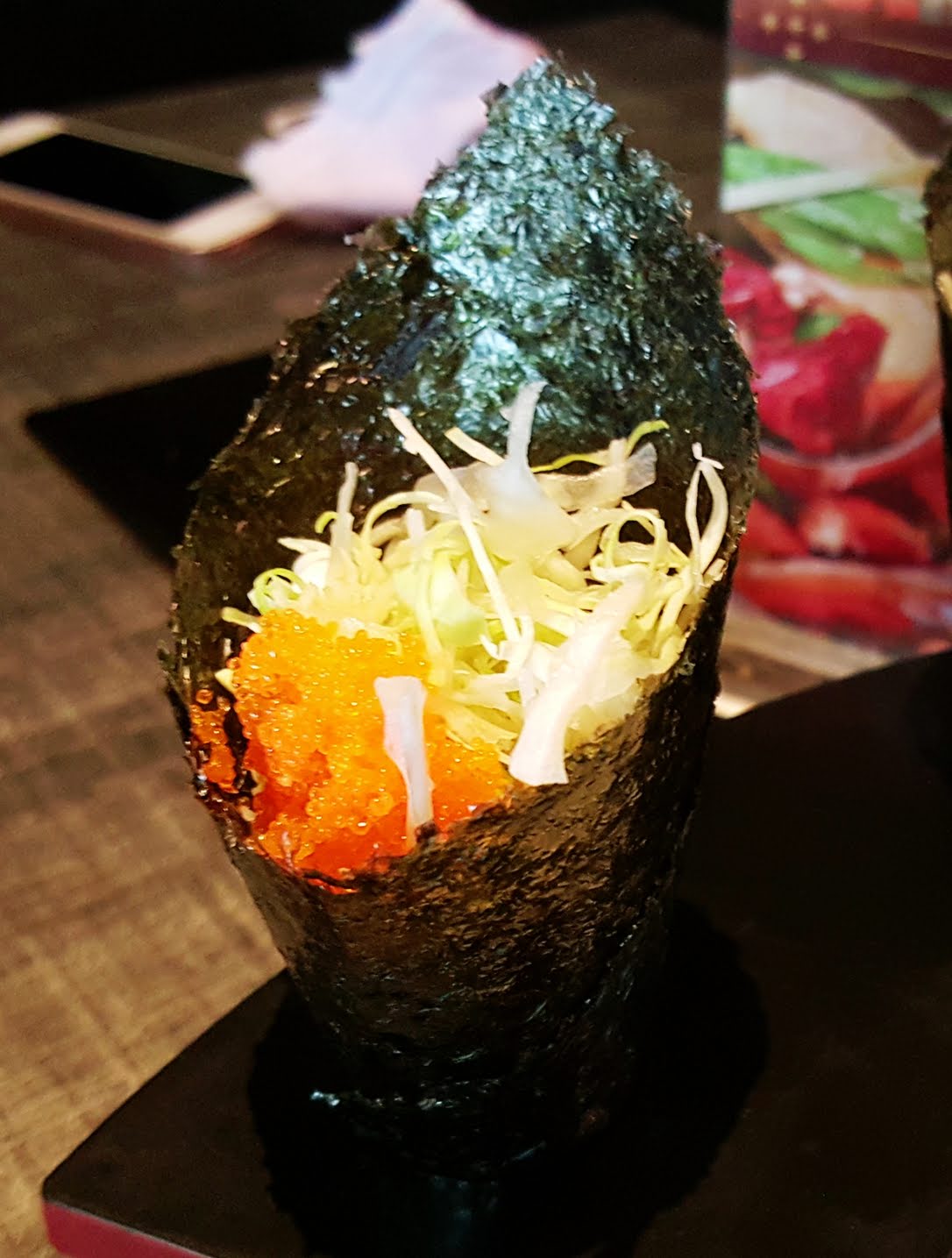 現做手卷,蟹肉、鮮蝦、蘆筍和蝦卵。