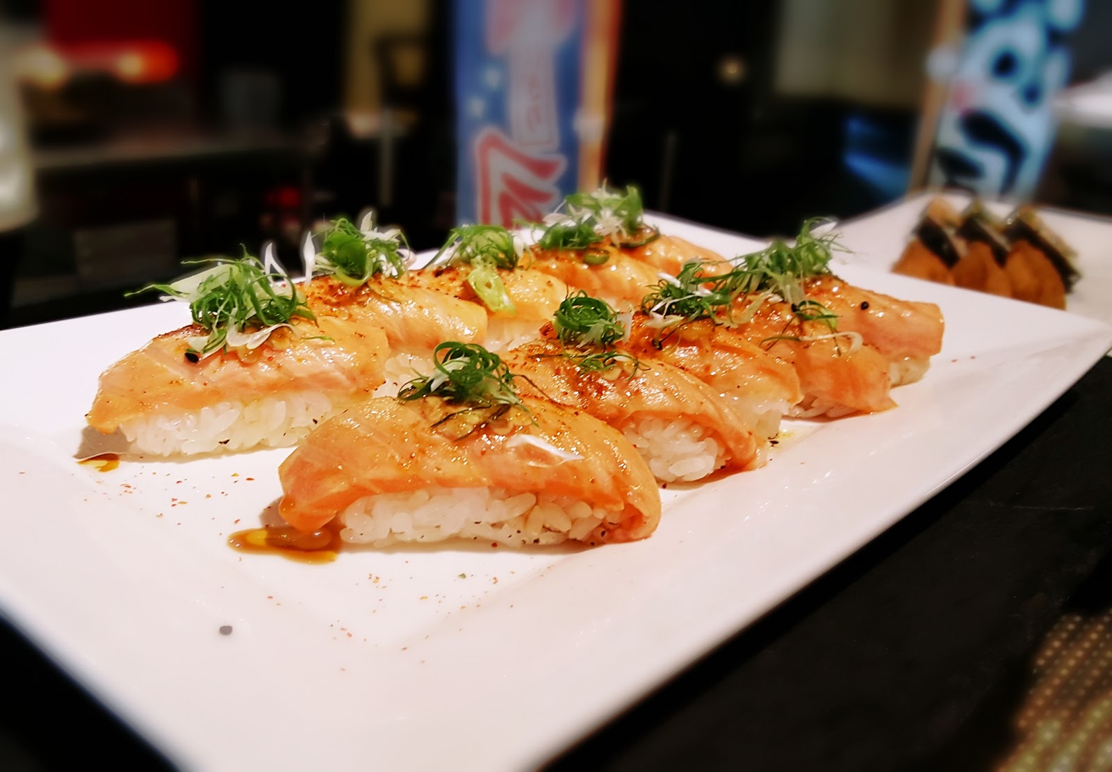 今天心中 MVP 之一『炙燒鮭魚握壽司』,厚薄適中的鮭魚上面鋪一點糖,經過炙燒後鮭魚表面形成焦糖,最後點上一點細蔥絲。一併放入口中,鮭魚油脂和焦糖一起融化在嘴裡,蔥絲畫龍點睛,口感很有層次。