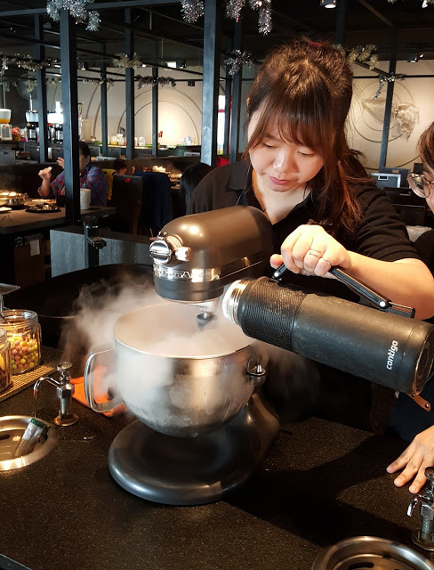 分子冰淇淋現場製作,將原料以攪拌機攪拌,加入-196度C液態氮瞬間冷卻食材,將液體轉化成固態的冰淇淋,不加入化學原料,吃起來口感清爽,比一般冰淇淋更滑順,一頓大餐後來一球很解膩。