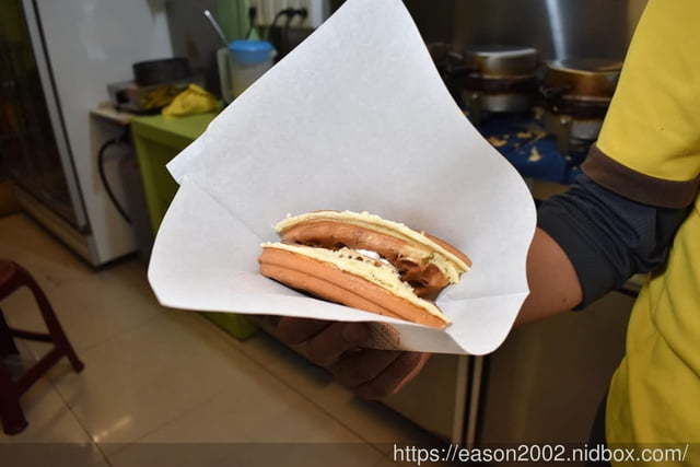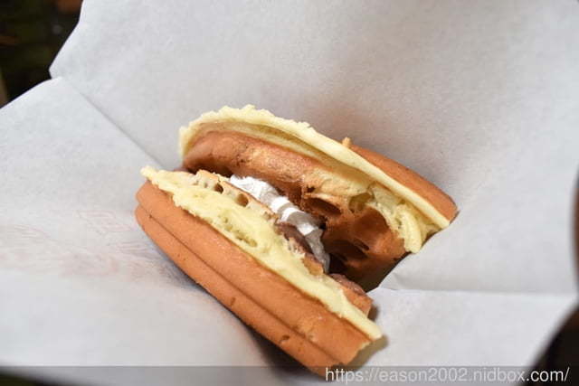 ●接著,是一般少見的「黑糖麻糬」口味,黑糖麻糬藏匿在鬆餅夾心裡,利用鮮奶油做點綴,讓Q軟口感的麻糬與鮮奶油香氣結合,再搭上鬆餅原有的風味,下午茶點心,真的讓人幸福感提升。