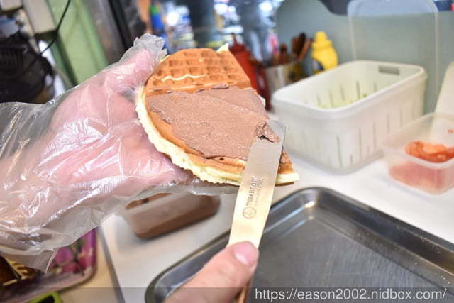 ●香頌可可瓦芙,在烤好的半片鬆餅上,塗上香濃的可可醬。