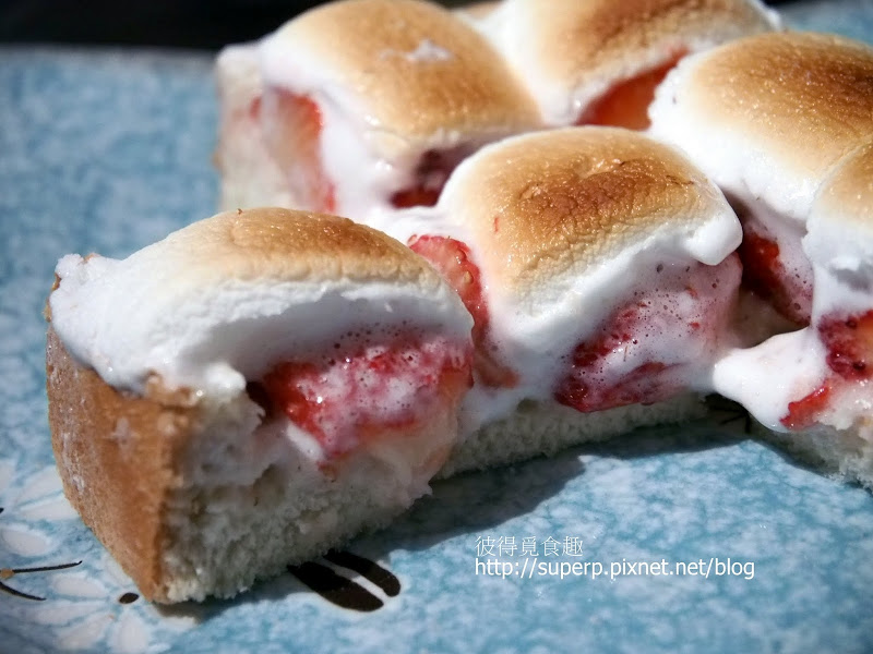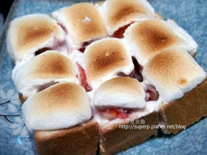 草莓棉花糖(這是老闆招待的。土司上放了草莓,上面再蓋著棉花糖下去烤。棉花糖外面烤的酥脆,裡面呈現融化狀,跟草莓以及土司一起吃,超級契合!還沒吃過這樣的組合,大推!)