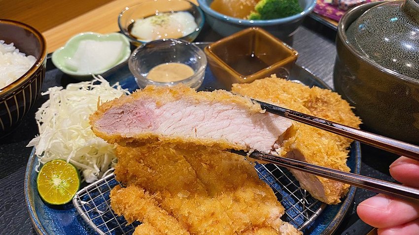 選用花蓮在地畜養豬肉所製成的厚切里肌豬排,而通常國內常見兩種豬排部位就屬里肌(莎朗)和腰內(菲力)兩種肉質。但原本想像中那油花分布均勻、充滿咬勁口感的里肌豬,在今天這份豬排上好像就欠缺一點油花感。因此,在口感和視覺上倒比較像鬆軟的腰內肉,與我喜歡那種會油脂溢滿口腔的爽快感有點落差,但還是滿好吃的