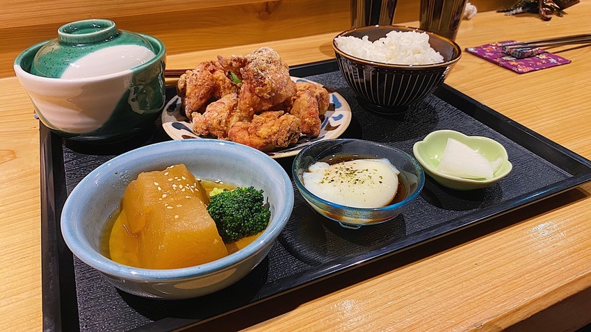 印象中,一般炸豬排店好像多以唐揚料理手法為主,但在季之雲卻可以品嘗到使用龍田炸的炸雞料理。一口咬下在氣味上好似帶點回甜香氣,又有點像是熟悉台式炸雞塊的感覺相當特別。配菜聽說每道都是老闆親手製作的,特別令人印象深刻的是小碗裡的日式大根煮,可以輕易的將之整塊托起,但也能很輕鬆的用筷子將蘿蔔劃開,調味恰到好處不會過鹹,我喜歡