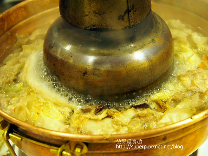 酸菜白肉鍋$980(吃酸菜白肉鍋就是要用這種炭火銅爐才有FU。這酸菜湯頭剛開始喝會稍微有點太酸,但隨著涮肉類的精華融入了湯頭後,喝起來鮮美帶著微酸,非常適中,好喝,大推!酸菜跟湯可以一直添加。)
