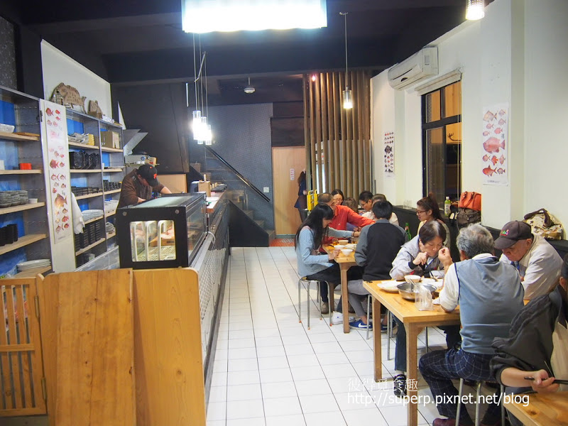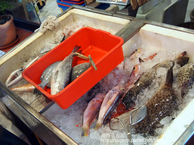 店內的裝潢一般。這天週末,一樓跟二樓都完全客滿。門口放著當天的漁獲。選擇性不多,基本上只有魚可選而已,這讓我很難點菜,真的就只有花枝,魚,以及青菜可點。