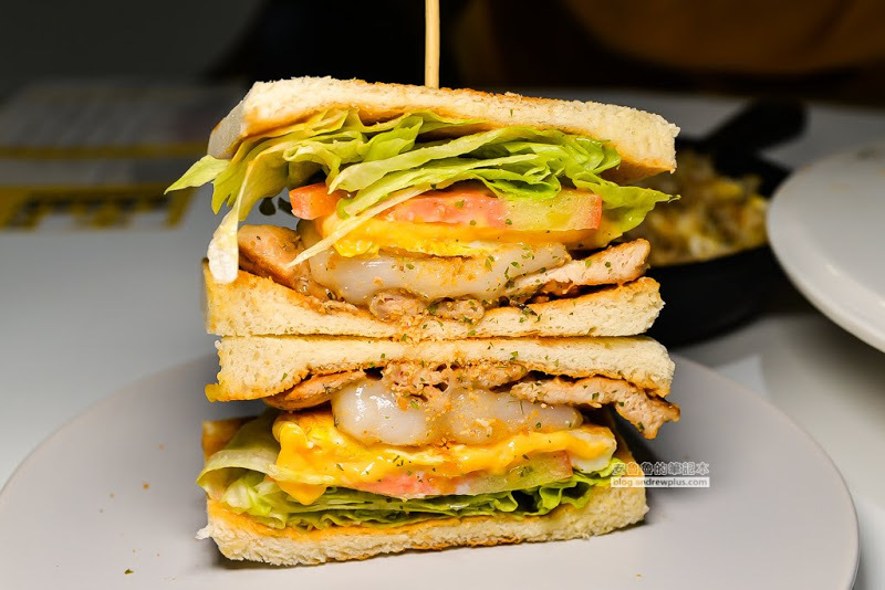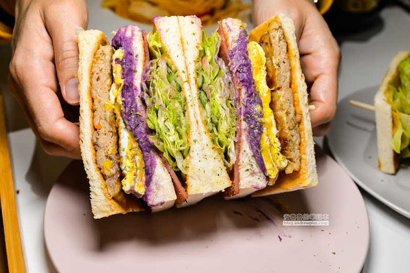 豐富的餡料有著讓人一口咬下就爆漿感覺,相較普羅雞肉歐姆厚蛋,生菜層多了火腿、小黃瓜,麻糬換成色彩鮮豔的紫薯,主角則由雞胸肉則換成了漢堡排