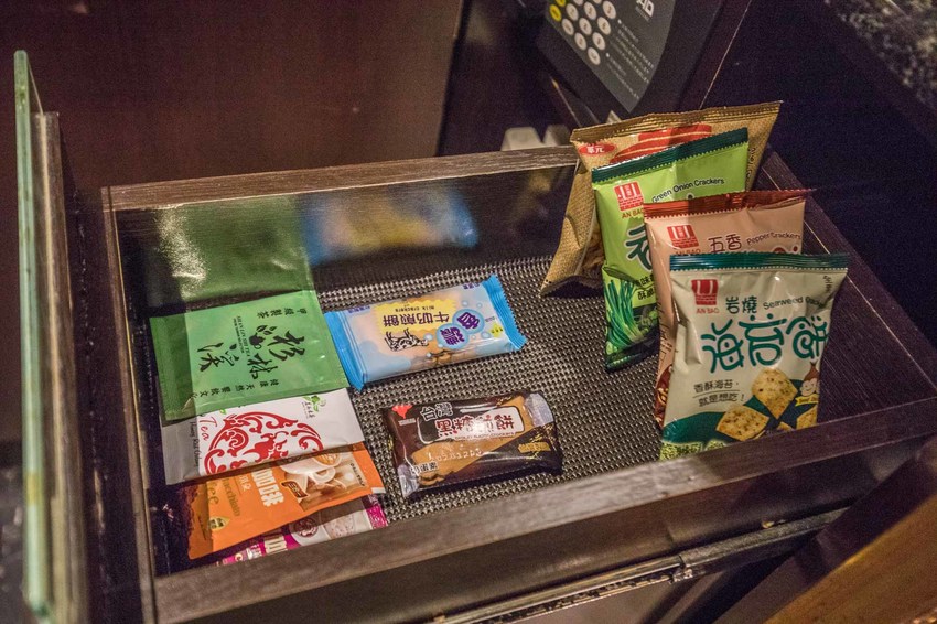 迷你吧台提供各式飲料、茶包、茶點餅乾,冰箱則在下面,裡面有兩瓶飲料,也有提供保險櫃